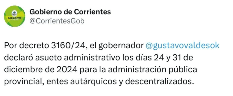 El gobernador Gustavo Valdés informó este lunes por la red social X del Gobierno de Corrientes que “por medio del decreto 3160/24, declaró asueto administrativo los días 24 y 31 de diciembre de 2024 para la administración pública provincial, entes autárquicos y descentralizados”.