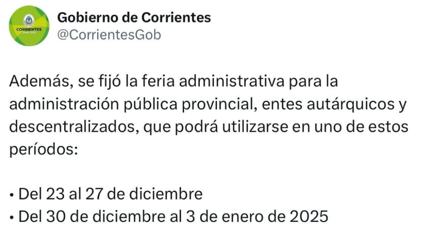 Por otro lado, notificó: “Además, se fijó la feria administrativa para la administración pública provincial, entes autárquicos y descentralizados, que podrá utilizarse en uno de estos períodos: del 23 al 27 de diciembre y desde el 30 de diciembre al 3 de enero de 2025”.