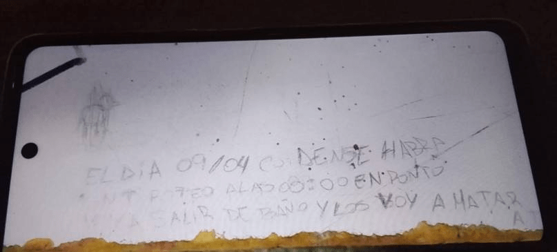 “El día 09/04 cuídense, habrá un tiroteo a las 8 en punto. Voy a salir del baño y los voy a matar”, decía la inscripción hallada en el aula, presuntamente escrita por un estudiante. La violencia del mensaje motivó una rápida intervención de las autoridades escolares.