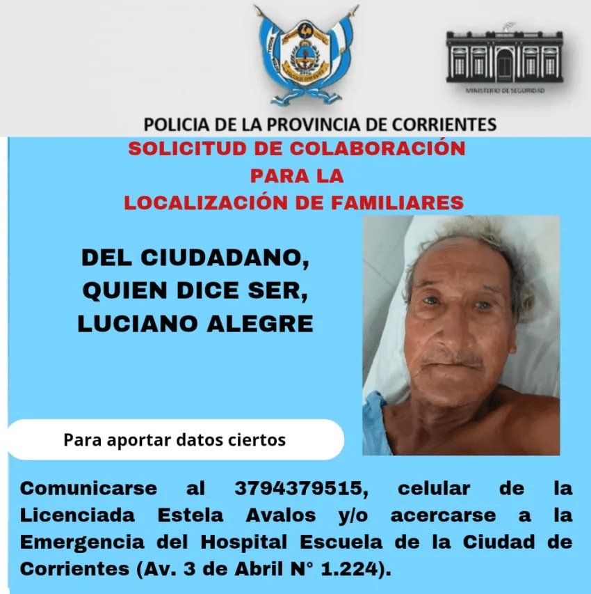El Hospital Escuela de la ciudad de Corrientes solicita la colaboración de la comunidad para localizar a los familiares de un hombre mayor de edad, quien manifestó llamarse Luciano Alegre y se encuentra internado en estado de desorientación.