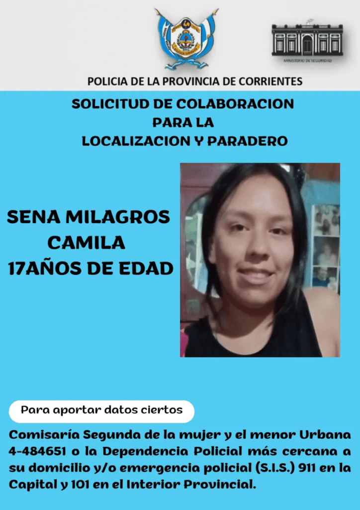 Se trata de Camila Milagros Sena, de 17 años, quien conforme a la denuncia efectuada por una persona de apellido Sánchez; la misma se habría ausentado de su hogar ubicado en el Barrio Anahi, dando intervención de ésta situación también a la fiscalía de Investigación en turno.