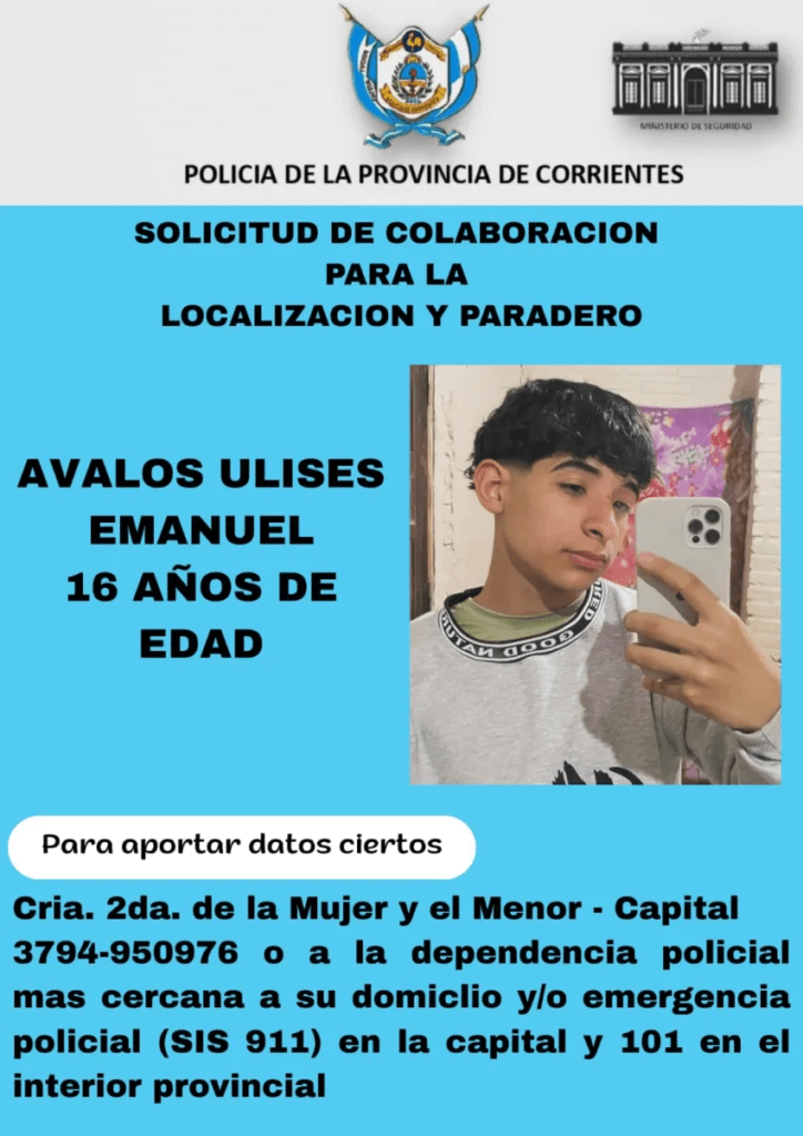 La Comisaría Segunda de la Mujer y el Menor solicitó la colaboración de la comunidad para dar con el paradero de Avalos Ulises Emanuel, un adolescente de 16 años, cuya desaparición fue denunciada este sábado 31 de enero de 2026.