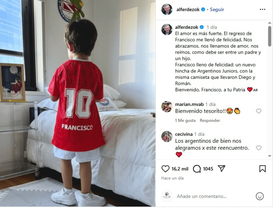 Compartió una foto del nene, de espaldas, usando una camiseta de Argentinos Juniors con el dorsal 10 y su nombre. “Francisco lleno de felicidad: un nuevo hincha de Argentinos Juniors, con la misma camiseta que llevaron Diego y Román”, añadió Fernández. Además, sobre la cama había una almohada con el escudo del club del que es hincha el expresidente. El mismo emblema se reproducía en un cuadro colgado de la pared.