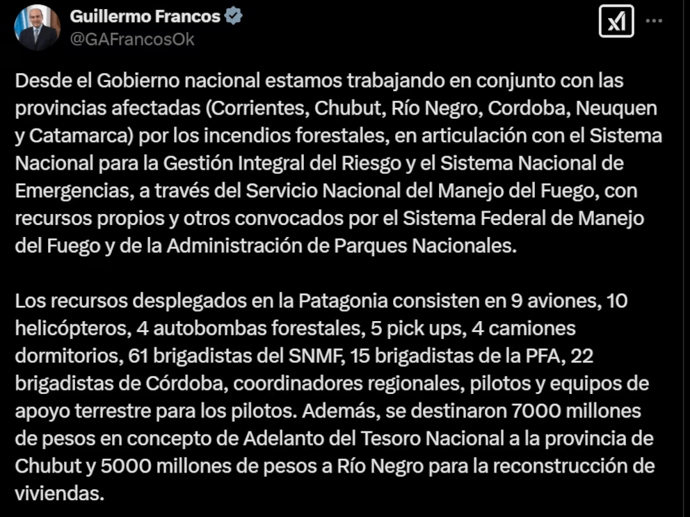 A través de diferentes mensajes que publicaron en sus cuentas de X, los principales funcionarios nacionales que intervienen en el tema destacaron las tareas que vienen realizando para tratar de apagar las llamas.