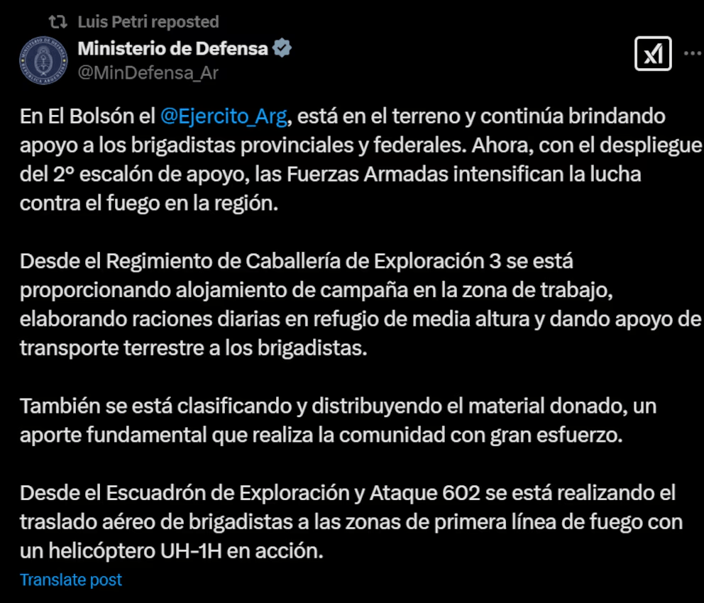 Asimismo, su par de Defensa, Luis Petri, reposteó un mensaje de la cartera que conduce, en el que se informa que el Ejército está cumpliendo diferentes tareas en la ciudad de El Bolsón, “brindando apoyo a los brigadistas provinciales y federales”.
