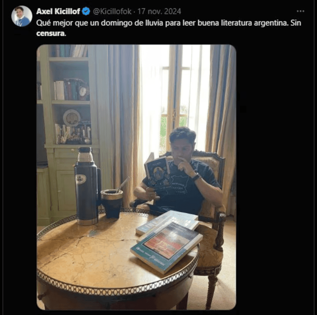 “¡Nunca es buen día para leer libros que exaltan la pedofilia y sexualizan a los niños, Kicillof! El libro que tenés en la mesa titulado “Si no fueras tan niña” es la historia de una niña de 14 años abusada por un adulto de 30, en serio usás esa tragedia para meterle mierda en la cabeza a los niños y adolescentes de la provincia de Buenos Aires?”, planteó Villarruel en sus redes.