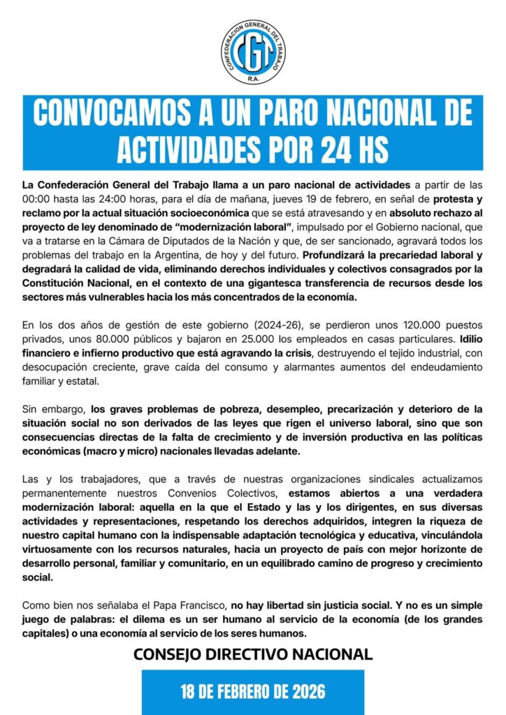 Desde la central sindical indicaron que el objetivo del paro es expresar su posición frente al proyecto y enviar una señal a los legisladores antes de la votación. Aclararon que la CGT no cuenta con representación parlamentaria propia para incidir directamente en el resultado y que la definición es una facultad exclusiva del Congreso.