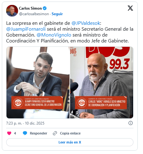 Juan Pablo Fornaroli, exIntendente de Mocoretá, será el Ministro Secretario General de la Gobernación. La decisión, para muchos, es una sorpresa. Carlos Vignolo será Ministro de Coordinación y Planificación, en modo Jefe de Gabinete. Ya se anticipó que Emilio Lanari asumirá como Ministro de Salud.