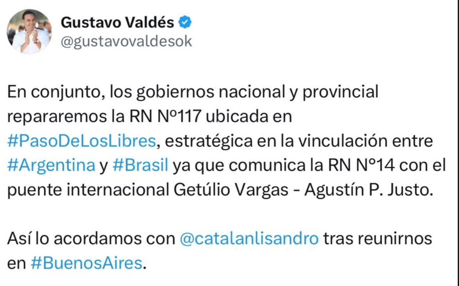 El gobernador Gustavo Valdés informó en su red social este miércoles que “en conjunto, los gobiernos nacional y provincial repararemos la RN Nº117 ubicada en Paso de los Libres, estratégica en la vinculación entre Argentina y Brasil ya que comunica la RN N°14 con el puente internacional Getúlio Vargas – Agustín P. Justo” y reveló que “así lo acordamos con Lisandro Catalán tras reunirnos en Buenos Aires”.