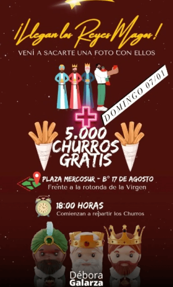 Este domingo 7, los tres Reyes Magos visitarán la Capital correntina con un obsequio inusual: más de 5 mil churros gratis que serán repartidos entre los niños que se acerquen a sacarse una foto con ellos.
