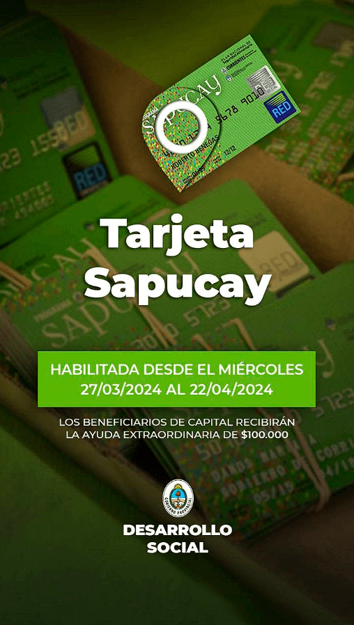 El Ministerio de Desarrollo Social de la Provincia informa que desde este miércoles 27 de marzo se habilitan las tarjetas Sapucay. Las mismas estarán activas hasta el 22 de abril del 2024.