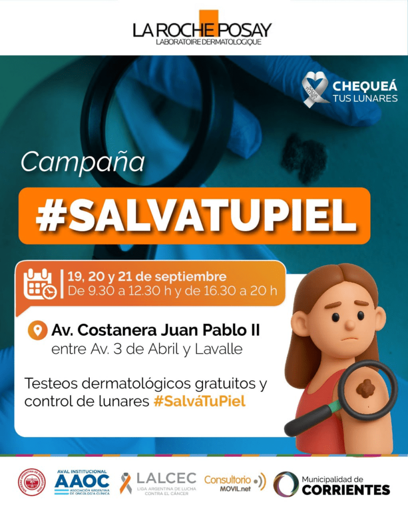 Como cada año, La Roche-Posay llevará adelante la campaña “Salva tu piel” con testeos dermatológicos gratuitos, en el marco de las acciones de prevención del cáncer de piel. Los operativos, que cuentan con el apoyo de la Municipalidad de Corrientes, se desarrollarán del viernes 19 al domingo 21 de septiembre, de 9 a 12.30 y de 16.30 a 20, en costanera Sur y Lavalle. La atención será por orden de llegada.