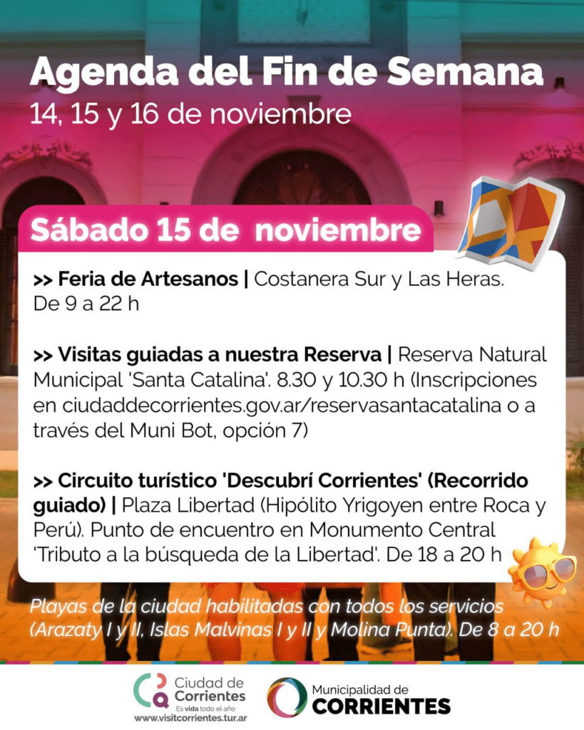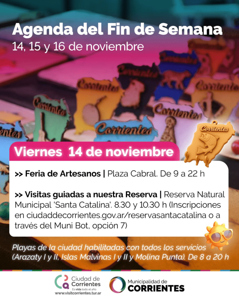 La Municipalidad de Corrientes preparó distintas actividades que se desarrollarán de viernes a domingo para el disfrute de vecinos y turistas. Entre ellas, ferias de artesanos, recorridos pedestres, competencia de rap y freestyle y la propuesta habitual de playas. Todas son totalmente gratuitas y abiertas a todo público.