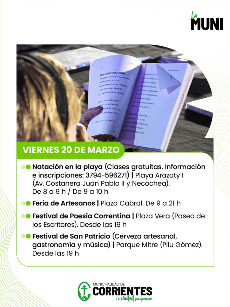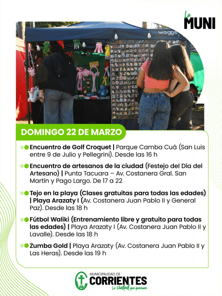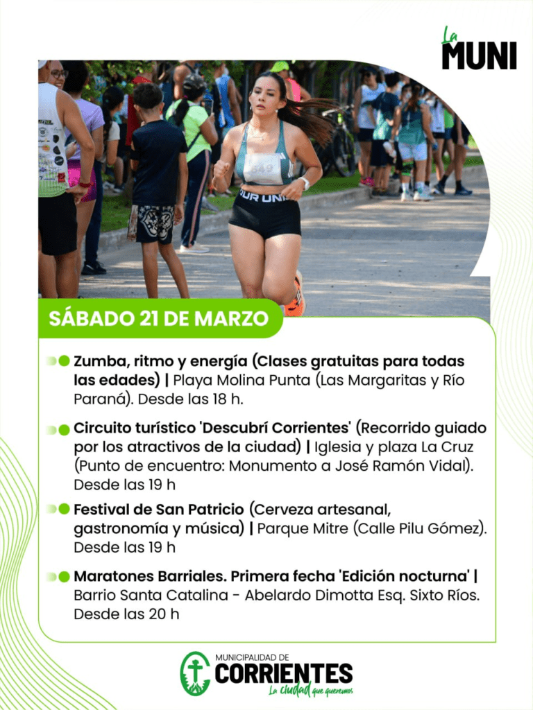 Desde este viernes 20 y hasta el martes 24 de marzo, la Municipalidad de Corrientes organizó una agenda cargada de eventos recreativos, deportivos y culturales. Entre los destacados se encuentran la fiesta de la cerveza, la primera fecha de las Maratones Barriales y una amplia oferta de clases gratuitas en los balnearios municipales.