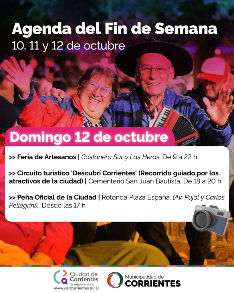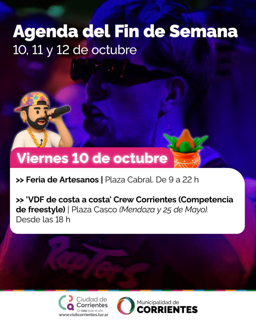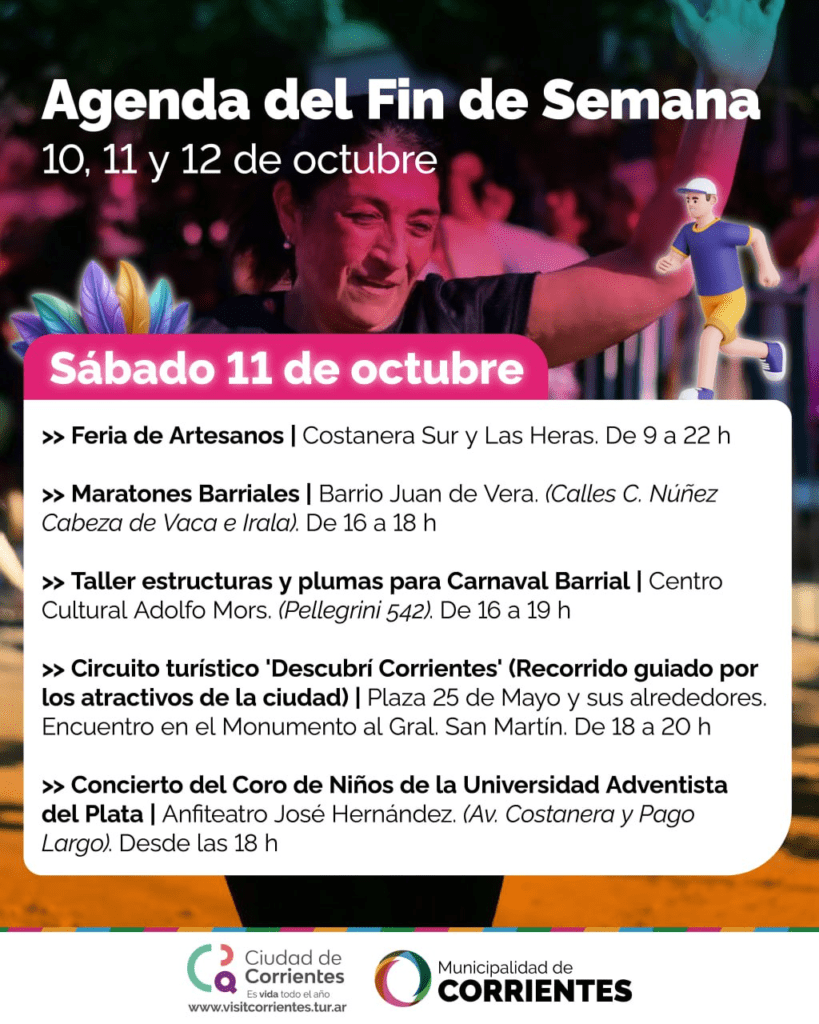 Desde el viernes y hasta el domingo, la Municipalidad de Corrientes preparó una agenda con diversas actividades al aire libre. Las propuestas que se desarrollarán en distintos espacios de la ciudad incluyen música para todos los gustos, danza, ferias de emprendedores y artesanos, deporte y mucho más. Todas las propuestas son totalmente gratuitas.De cara a un fin de semana largo, por el feriado nacional por el Día del Respeto a la Diversidad Cultural, la Municipalidad de Corrientes propone un amplio abanico de ofertas culturales y de esparcimiento para vecinos y turistas. Entre las alternativas previstas habrá freestyle, una nueva edición de maratones barriales, ferias de emprendedores, visitas pedestres guiadas, peña y más opciones para el disfrute de grandes y chicos.La tradicional Feria de Artesanos tendrá lugar el viernes, de 9 a 22, en la plaza Cabral, como siempre con una amplia variedad de creaciones únicas y productos locales. Mientras que el sábado y domingo, en el mismo horario, se trasladará a Costanera Sur y Las Heras, brindando una oportunidad para disfrutar del paseo junto al río y descubrir piezas únicas realizadas por emprendedores locales. Se podrán adquirir productos en cuero, madera, tejido, dulces regionales, comidas típicas y floricultura.Desde el viernes y hasta el domingo se desarrolla la competencia de freestyle “VDF de Costa a Costa”. A las 18, tendrá lugar el primer desafío en la plazoleta Casco (Mendoza y 25 de Mayo). El sábado el evento se trasladará a Mercedes, Goya e Ituzaingó, y el domingo, a Saladas.Bajo el slogan “Ponete la zapatilla y vamos a correr por la ciudad”, el barrio Juan de Vera (calles C. Núñez, Cabeza de Vaca e Irala) recibirá el sábado 11 de octubre, a una nueva edición de las maratones barriales, de 16 a 18. Habrá dos distancias: 2 KM Participativo y 5 KM Competitivo.Desde las 18, en el anfiteatro José Hernández (Av. Costanera Gral. San Martín y Pago Largo) tendrá lugar un concierto del coro de niños de la Universidad Adventista del Plata.CARNAVALEl sábado, de 16 a 19, en el Centro Cultural Adolfo Mors (Pellegrini 542) se realizará un nuevo taller de estructuras y plumas de carnaval: tocados y espaldarines, rumbo a la próxima edición de los Carnavales Barriales. Los interesados deben comunicarse al teléfono: 3794-279020 o al correo: culturayeducacionmcc@gmail.com.El domingo, desde las 17, en la Rotonda Plaza España (Av. Pujol y Carlos Pellegrini) se llevará adelante una nueva Peña Oficial de la Ciudad. En esta ocasión, actuarán: el elenco Selva Guaraní, el Ballet Inclusivo “Divino Niño Jesús”, Pablito Pando y Tadeo Morán, Los Puros del Chamamé, Braian Acevedo, La Unión del Paraná, La Junta Chamamecera, Benjamín y Joaquín Morales. Habrá además feria gastronómica y de emprendedores.VISITAS GUIADASEl sábado 11, se realizará el habitual circuito turístico “Descubrí Corrientes” con un recorrido guiado por los atractivos de la ciudad. En esta oportunidad será en la plaza 25 de mayo y sus alrededores, con el punto de encuentro en el Monumento al General San Martín, de 18 a 20.El domingo, en tanto, la visita guiada será al cementerio San Juan Bautista, de 18 a 20. Inscripción se realiza a través del siguiente link: https://visitcorrientes.tur.ar/descubri/TEMPORADA DE PLAYASLos cinco balnearios de la ciudad están oficialmente habilitados. Se trata de Arazaty I y Arazaty II, Malvinas I y Malvinas II (balneario recreativo exclusivo para canes), y Molina Punta. Los visitantes pueden acceder a la playa de 8:00 a 20.Cabe señalar que en Arazaty I y II y Malvinas I, los sanitarios permanecerán abiertos hasta las 2.30 de la madrugada. |