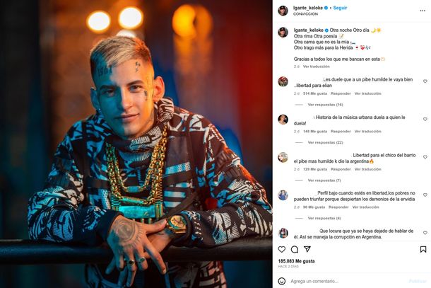 Desde la cárcel, L-Gante publicó el domingo pasado un mensaje en Instagram con parte de sus versos y el agradecimiento a sus fans y allegados por “bancar en esta.