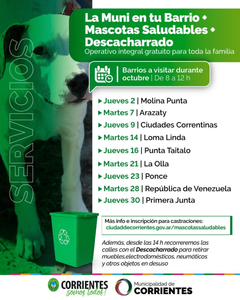 En cada operativo, La Muni en tu Barrio estará acompañado del programa Mascotas Saludables, que promueve la tenencia responsable de los animales domésticos, acercando atención veterinaria gratuita, vacunación antirrábica, desparasitaciones y esterilizaciones (castraciones). Este último servicio debe requerirse con antelación a través del turnero web (https://ciudaddecorrientes.gov.ar/mascotassaludables), por contar con un cupo limitado por cada operativo.